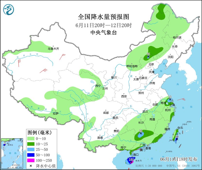 圖3 全國降水量預報圖(6月11日20時-12日20時)