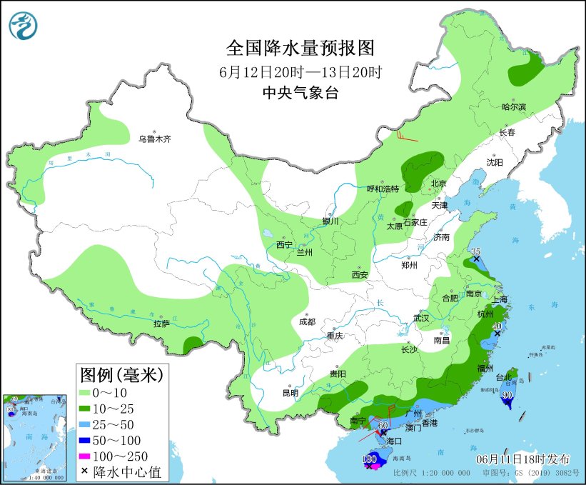 *6月12日20時至13日20時,*黑龍江中北部、河北西部、江南東部和南部、華南大部、台灣島等地部分地區有中到大雨,其中,廣東西南部沿海、海南島大部、台灣島南部等地部分地區有暴雨或大暴雨(100~180毫米)。內蒙古中部、廣西東南部沿海、廣東西南部等地部分地區有4~6級風。南海海域、北部灣將有6~8級、陣風9級大風,其中,南海西北部和中西部的部分海域風力可達9~11級、陣風12級,東海大部海域、台灣海峽、巴士海峽、台灣以東洋麪將有6~8級風、陣風9級(見圖4)。