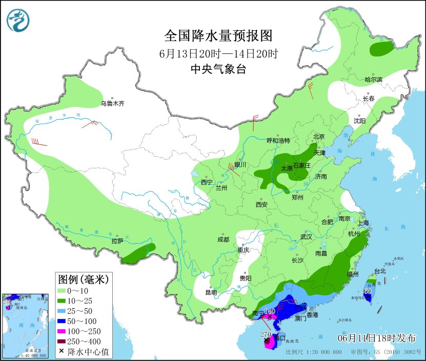 *6月13日20時至14日20時,*廣西東部和南部沿海、廣東中西部和東南部沿海、海南島、台灣島大部等地部分地區有大到暴雨,其中,廣西東南部沿海、廣東西南部、海南島中西部等地部分地區有大暴雨,海南島西部等地局地特大暴雨(250~270毫米)。內蒙古中西部、寧夏中部、新疆南疆盆地、華南沿海等地部分地區有4~6級風,廣西東南部沿海、廣東西南部等地部分地區有6~7級風。東海大部海域、台灣以東洋麪、南海大部海域將有5~7級、陣風8級大風,其中,南海西北部海域、北部灣、瓊州海峽將有7~9級、陣風10級(見圖5)。