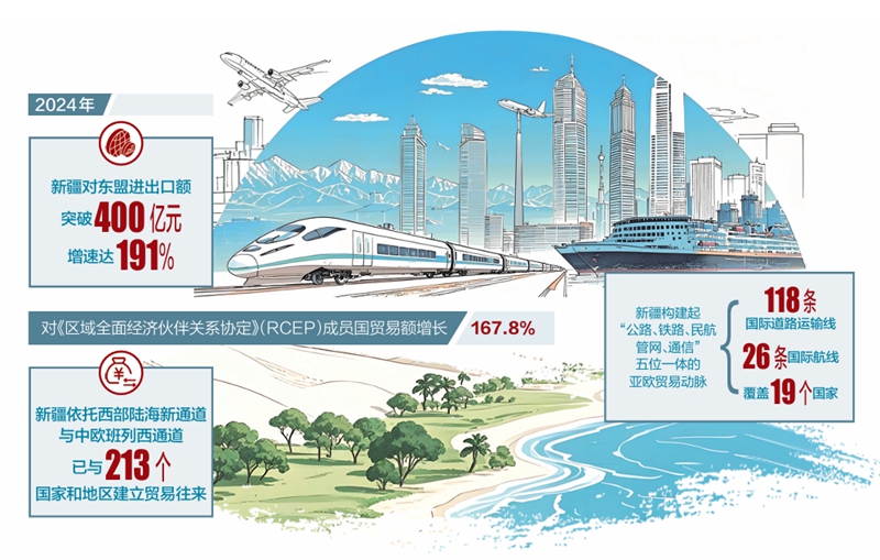 笛聲長鳴,班列飛馳。在烏魯木齊國際陸港區,滿載機械設備與紡織品的列車正駛向東南亞;在北部灣,新疆的優質林果與番茄跨越山海登上貨輪抵達東盟市場。在東盟連續5年穩居中國第一大貿易伙伴的背景下,作為“一帶一路”核心區,中國新疆正以全方位開放姿態深化與東盟經貿合作。2024年,新疆對東盟進出口額突破400億元,增速達191%;對《區域全面經濟夥伴關係協定》(RCEP)成員國貿易額增長167.8%。