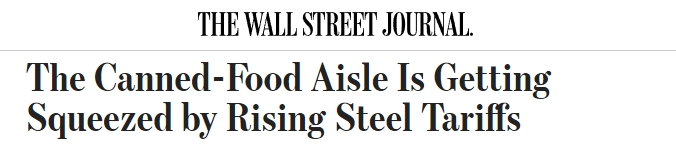 美國消費者品牌協會(成員包括金寶湯、荷美爾等企業)稱,特朗普政府對進口鋼材徵收的關税可能會使罐裝食品的商店售價上漲9%至15%。例如,一罐售價2美元的蔬菜可能會漲價18至30美分。特里維姆包裝公司負責戰略的副總裁丹·迪特里希説:“美國消費者將為他們的罐頭支付更高的價格。”