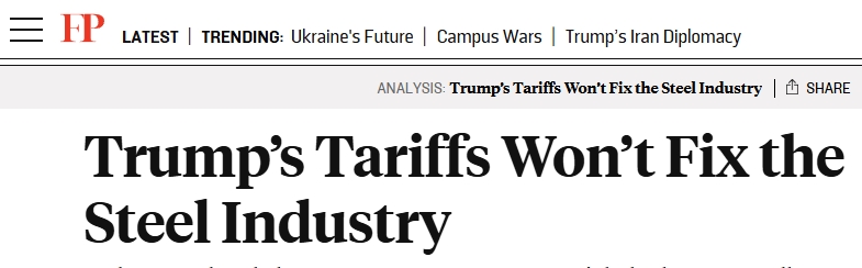 美國《外交政策》網站(Foreign Policy)近期發表題為《特朗普的關税無法拯救鋼鐵業》的分析文章稱,徵收高額關税使鋼鐵和鋁的價格提高,但對美國國內鋼廠的幫助卻微乎其微,反而會給工廠帶來沉重打擊。專家也表示,這些關税將阻礙美國政府重建美國工業的計劃,還會使與其他國家正在進行的貿易談判變得複雜,而且對解決困擾全球鋼鐵業數十年的結構性問題毫無幫助。