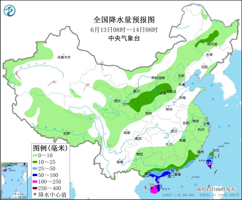 圖3 全國降水量預報圖(6月12日08時-13日08時)