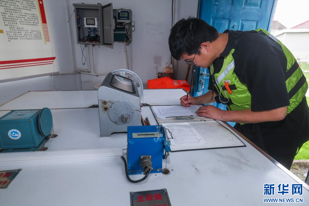 6月11日,嘉興市南湖區餘新鎮水位站工作人員記錄不同時段的河道水位,確保本輪強降雨期間數據即時回傳至防汛指揮系統。