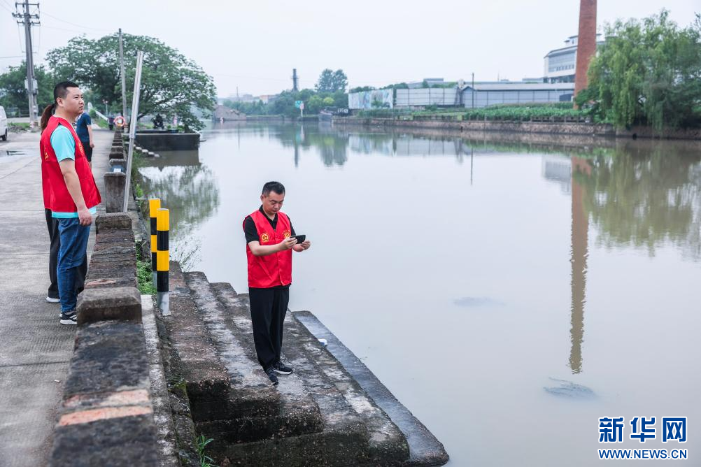 6月11日,嘉興市南湖區餘新鎮黨員幹部巡查重點河段水位情況及堤岸穩固性。