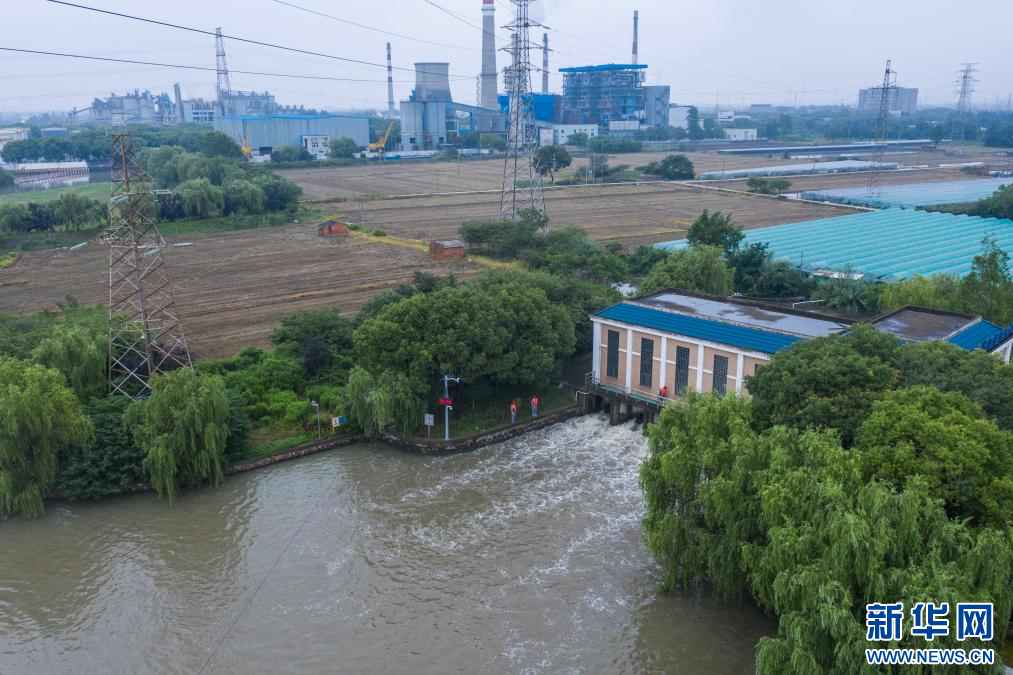 6月11日,嘉興市南湖區大橋鎮十八里圩區夏義港泵站在排澇(無人機照片)。