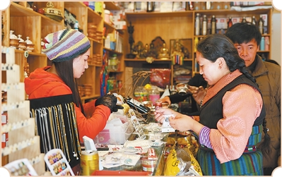 遊客在吉隆鎮吉甫村購買當地特色商品。