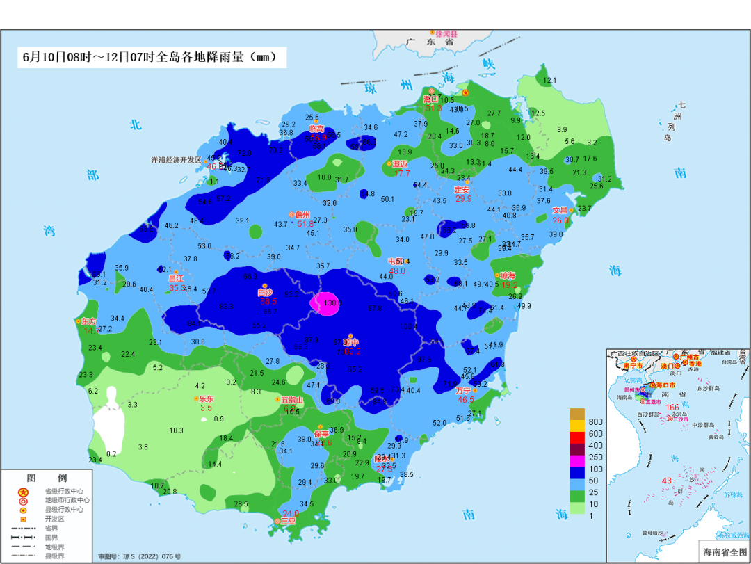 *過程風雨實況統計:*10日08時—12日07時,瓊中、五指山、昌江、萬寧、儋州、白沙、陵水、瓊海、保亭、澄邁、定安、屯昌和臨高13個市縣共62個鄉鎮雨量超過50毫米,其中瓊中、五指山和昌江3個市縣共4個鄉鎮雨量超過100毫米,最大為瓊中縣黎母山鎮130毫米。另外,海南島四周沿海陸地及東部近海普遍出現7~9級陣風,最大為東部近海10級(25.8米/秒)。此外,三沙市最大雨量為西沙東島166.4毫米,最大陣風為中建島11級(30.9米/秒)。