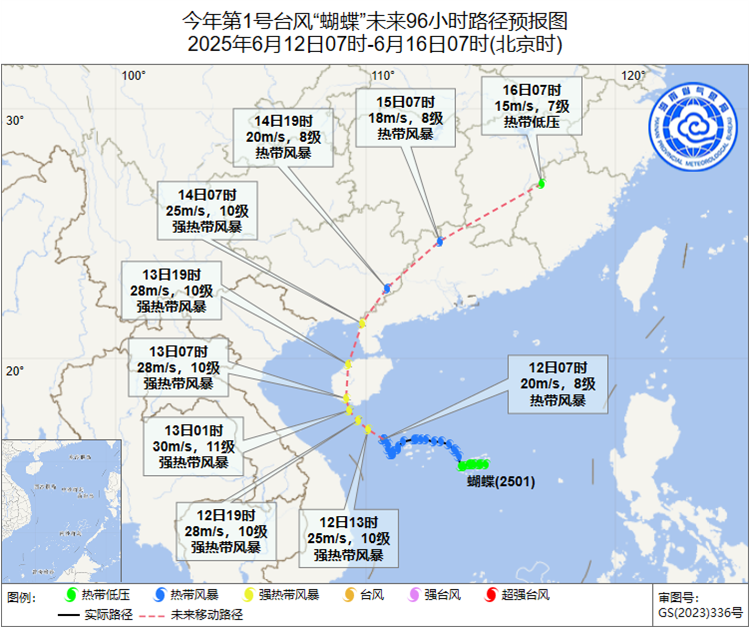 “蝴蝶”將逐漸趨向並登陸海南陵水至樂東一帶沿海地區,*12日—14日白天,海南島大部地區有強風雨天氣,城鄉積澇、地質災害以及中小河流洪水等次生災害的風險較高,*相關部門需加強水庫巡查、城市排水、道路疏導、旅遊設施安全、地質災害風險隱患點管理等工作。