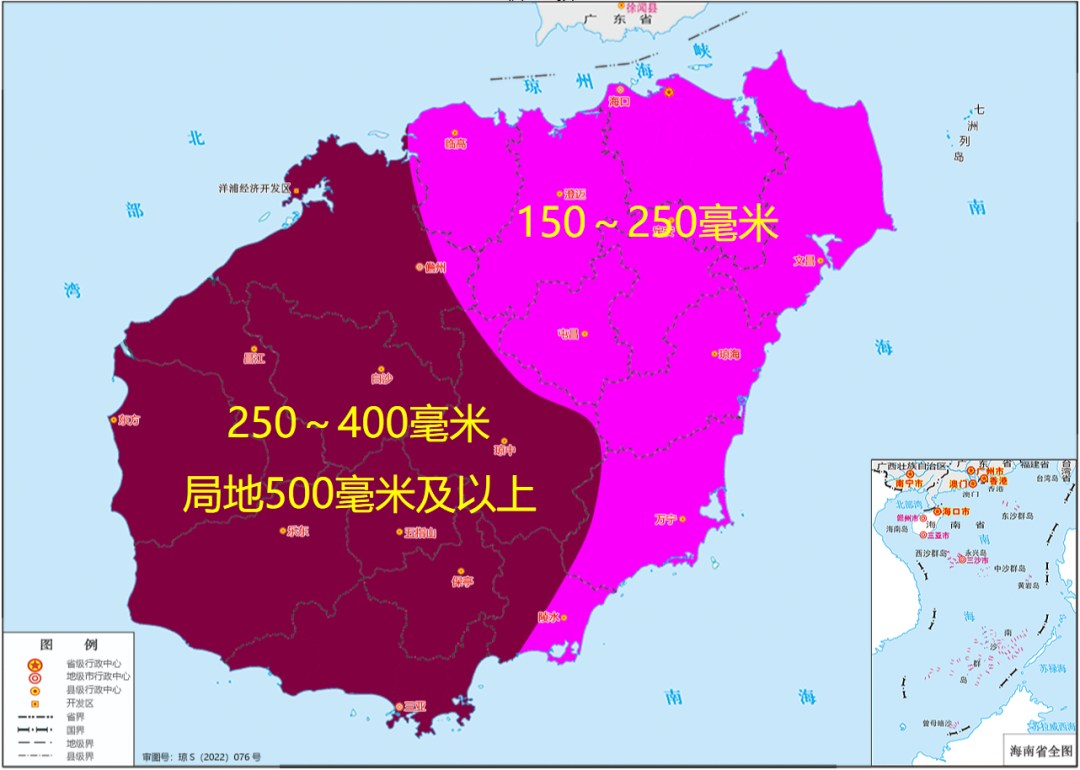 預計,12日08時—14日20時各地累積雨量:三亞、保亭、五指山、瓊中、樂東、白沙、昌江、儋州和東方等市縣250~400毫米、局地500毫米及以上,海口、定安、澄邁、臨高、屯昌、文昌、瓊海、萬寧和陵水等市縣150~250毫米。