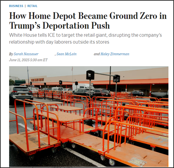報道稱,最早盯上這兩個地方的是白宮國土安全顧問、移民議程制定者斯蒂芬·米勒,他在5月底一次ICE全國高級官員會議上建議該部門的特工應該*瞄準家得寶和711便利店,直接前往那裏逮捕這些非法移民,*而不是像以往針對外籍黑幫人員和暴力罪犯那樣走流程再實施抓捕。