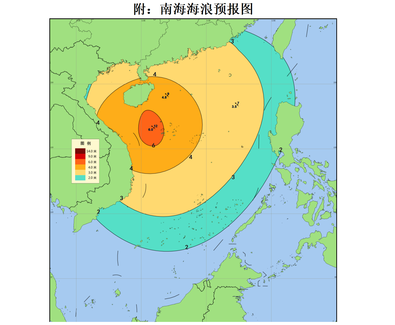 海南島以南、西沙附近海面有4.0~6.0米的巨到狂浪。雷州半島以東、北部灣南部、海南島以東、南沙北部海面有4.0~5.0米的巨浪。北部灣北部、瓊州海峽海面有3.0~4.0米的大到巨浪。東沙附近、中沙附近、南沙以南到曾母暗沙附近海面有2.5~3.5米的大浪。近海海域海浪預警級別為黃色。