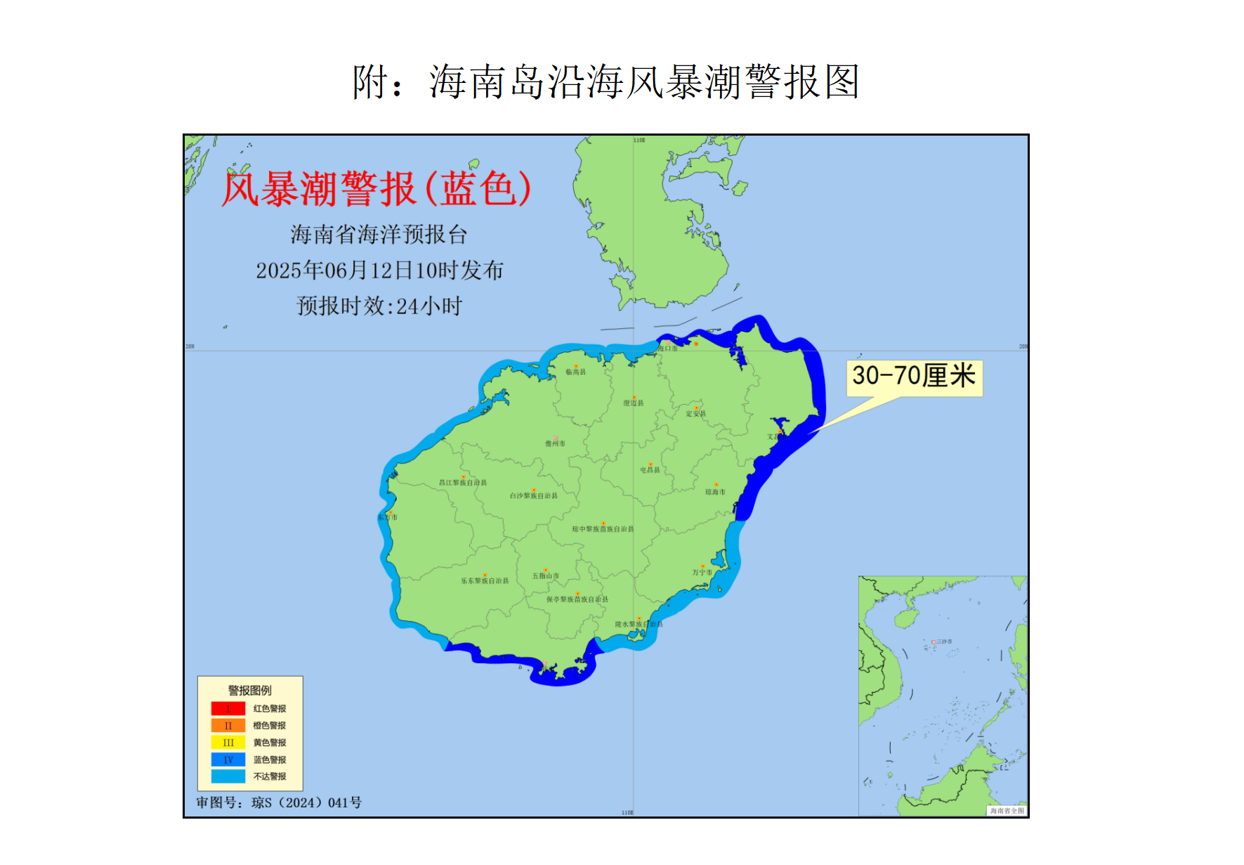 此外,海南省海洋預報台6月12日10時發佈風暴潮藍色預警:受今年第1號颱風“蝴蝶”(熱帶風暴級)影響,預計6月12日上午至13日上午,海南島沿海將出現30到70釐米的風暴增水,海口市、文昌市、瓊海市和三亞市的風暴潮預警級別為藍色。
