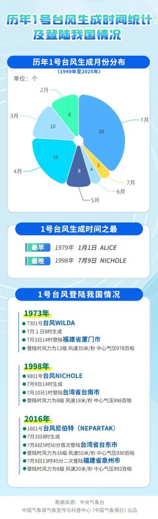 氣象上通常將當年西北太平洋及南海生成的首個編號颱風稱為“初台”。統計顯示,每年1號颱風生成的時間分散在1月至7月。1979年的“初台”在元旦當天就生成了,而1998年的“初台”則直到7月9日才出現。常年平均“初台”生成時間為3月25日,從這個角度看,今年第一個颱風有點姍姍來遲了。