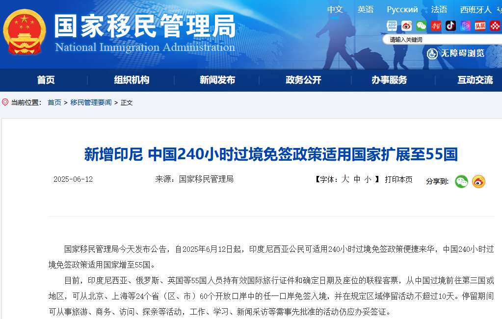 【環球網財經綜合報道】6月12日,國家移民管理局發佈一則重磅消息,自當日起,印度尼西亞公民可適用240小時過境免籤政策便捷來華,這標誌着中國240小時過境免籤政策適用國家增至55國。