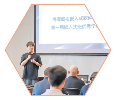 杭州電子科技大學與海康威視舉辦的嵌入式特色課程班結業儀式上,校友黃賢盛(左)在分享工作經驗。