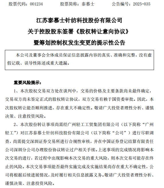 6月12日,泰慕士(001234)發佈公告稱,公司控股股東如皋新泰、南通泰達、南通泰然擬通過“股份轉讓+表決權放棄”的方式,將控股權轉讓給廣州輕工工貿集團有限公司(簡稱“廣州輕工”)。一旦交易完成,廣州輕工將成為泰慕士的控股股東,廣州市人民政府將成為公司的實際控制人。