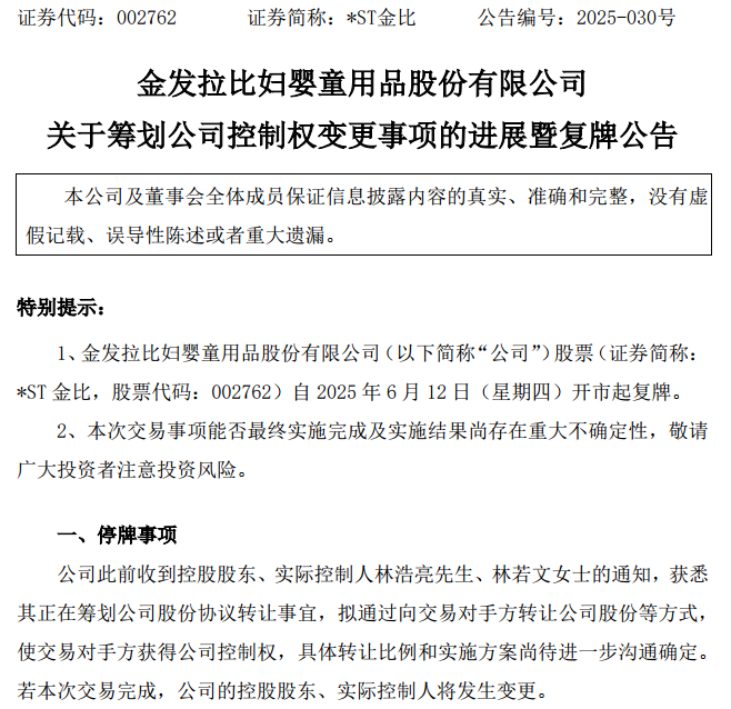 【環球網消費綜合報道】6月12日,金髮拉比婦嬰童用品股份有限公司(*ST金比,002762)股價開盤即一字漲停,報6.47元/股。這一漲勢背後,是公司控制權變更事項取得新進展。
