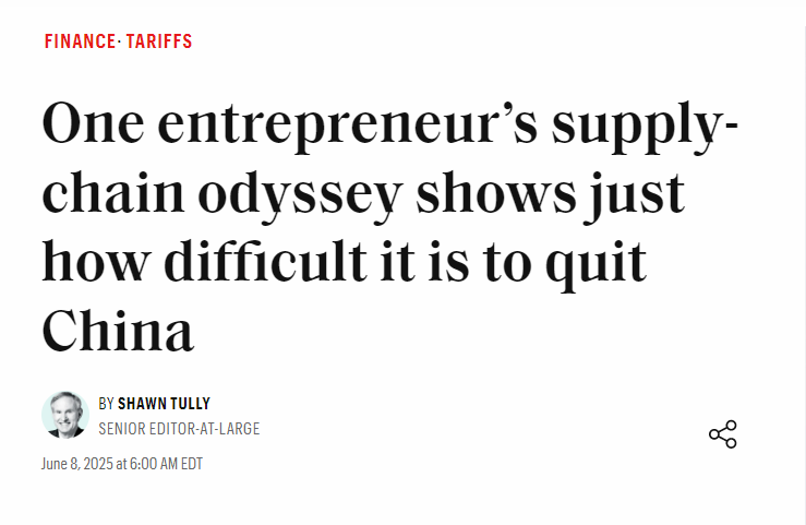 美國《財富》雜誌網站6月8日刊發文章《一個企業家艱難“去中國化”的啓示》,闡述了中國供應鏈與產業鏈的優勢,也揭示了美國製造業迴流面臨的巨大挑戰。