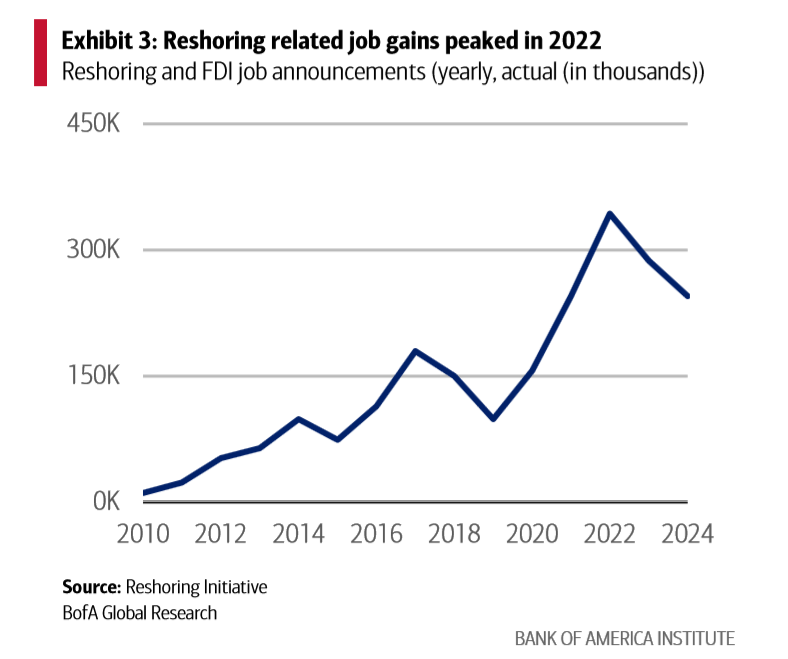 報告顯示,美國製造業迴流創造的就業機會在2022年達到高峯後開始減少。