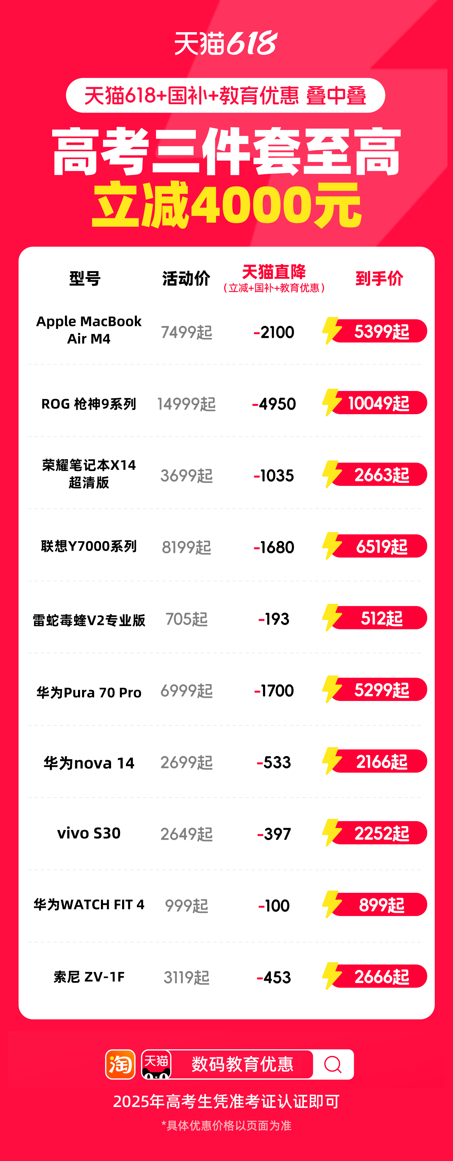 憑準考證就能享受天貓618優惠“疊中疊”,高考三件套至高立減4000