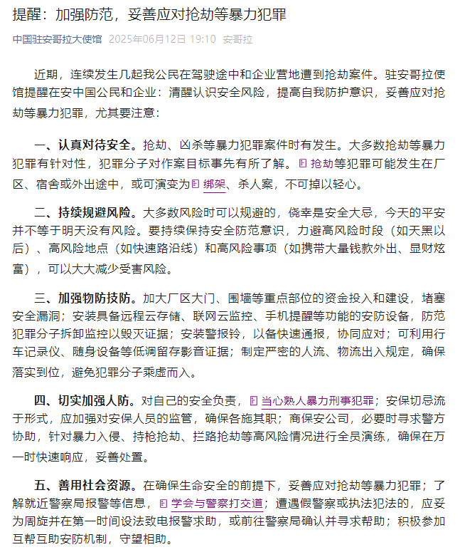 近期連發幾起我公民遭搶劫案件,中國駐安哥拉大使館發佈提醒