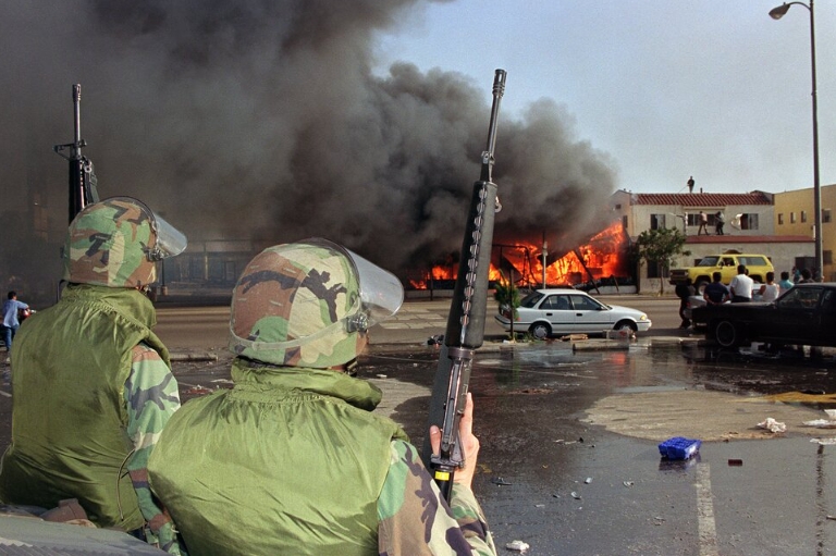 據美國加州“軍事博物館”網站記載,20世紀90年代初的洛杉磯堪稱一座“犯罪之都”,各種勢力盤根錯節,黑幫分子橫行街頭。在嚴重的社會治安問題之外,各少數族裔間的種族衝突也很尖鋭。1991年3月,非裔青年羅德尼·金因超速被洛杉磯警察攔停,他在接受檢查時試圖反抗,後被4名白人警員“用警棍抽打了50多次”。這宗暴力執法事件讓社會各界羣情激憤,多家媒體密集報道,當時僅《洛杉磯時報》一家報紙就刊登了40多篇文章。