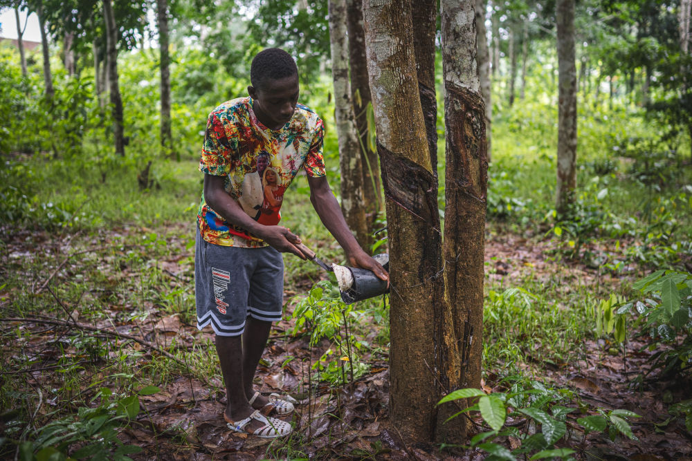 2025年5月30日,橡膠種植户在科特迪瓦聖佩德羅省大貝雷比鎮收割橡膠。新華社記者 王冠森 攝