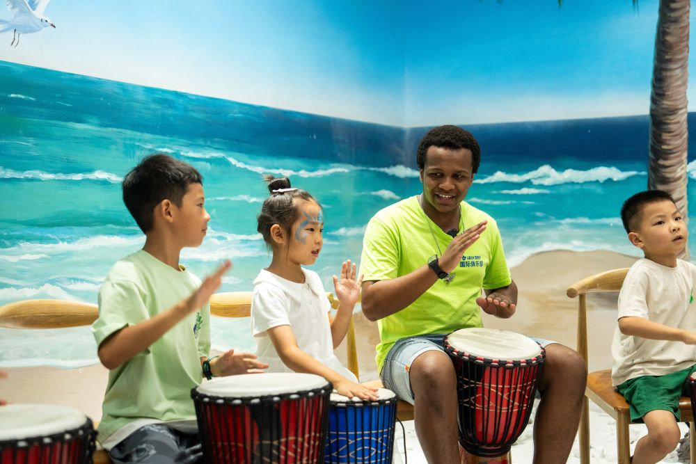 2024年8月30日,在位於湖南高橋大市場的中非經貿博覽會常設展館安哥拉館,志願者(右二)帶領學生學習非洲鼓。新華社記者 陳思汗 攝