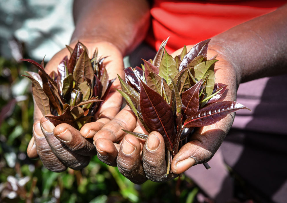 2024年5月6日,在肯尼亞穆拉雅郡的一處紫茶園,茶農展示採摘下來的紫茶。新華社記者 韓旭 攝