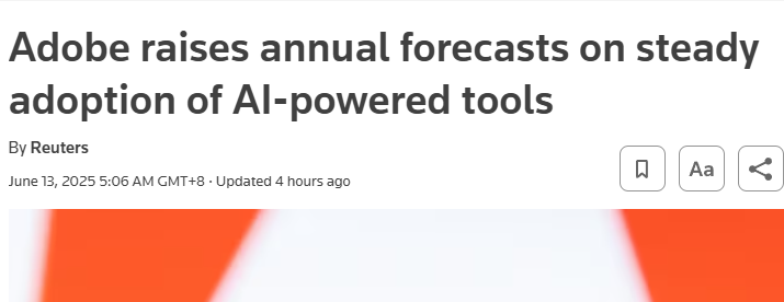 【環球網財經綜合報道】據路透社報道,得益於市場對生成圖像和視頻內容的AI驅動軟件工具的持續需求,Adobe上調了全年業績預期。