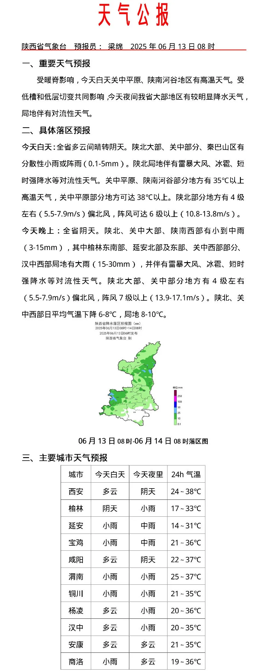 受高空槽和低層切變共同影響,預計6月13日15時至14日15時,陝北、關中北部及西部、漢中西部有雷暴天氣,其中榆林南部、延安大部、銅川西部、咸陽北部、寶雞大部、漢中西部局地有雷暴大風,陣風可達8級以上,榆林東部局地、延安北部及東部局地、咸陽北部局地、寶雞北部局地有冰雹,榆林東部局地、延安東部及西部局地、咸陽北部局地、寶雞北部有短時強降水。
