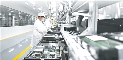 為推動科技創新與產業創新融合發展,河北雄安新區積極構建各類創新主體緊密融合的成果轉化生態體系。圖為在雄安科創中心中試基地,雄安百信信息科技有限公司工人在服務器生產線上工作。