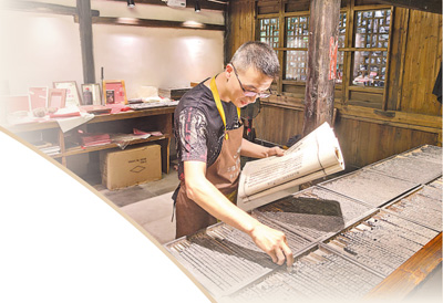 排版完畢,先給印版刷上清水,再將墨汁均勻塗抹在印版上,鋪上宣紙用刷子來回印刷。揭開後,一張墨跡清晰的豎寫宋體書頁便躍然眼前了。