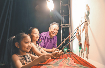 侯建川與孩子們共同表演孝義皮影戲。
