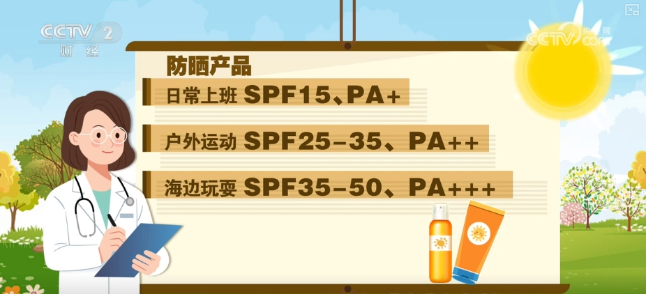 一般來説,日常上班可以選擇SPF15、 PA+的防曬產品,户外運動時可選擇SPF為25—35、PA++的防曬產品,海邊玩耍時可選擇SPF為35—50、PA+++的防曬產品。