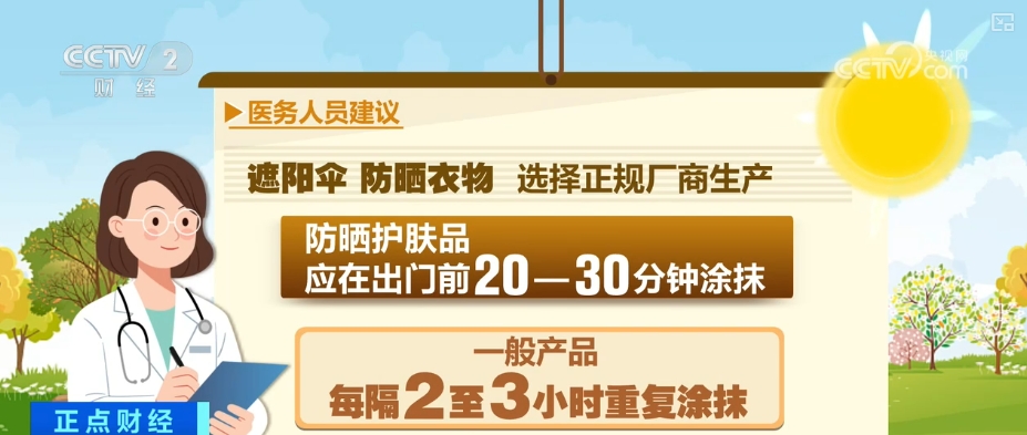 醫務人員建議,遮陽傘和防曬衣物一定要選擇正規廠商生產的。防曬護膚品應在出門前20—30分鐘塗抹,一般產品需每隔2—3小時重複塗抹。