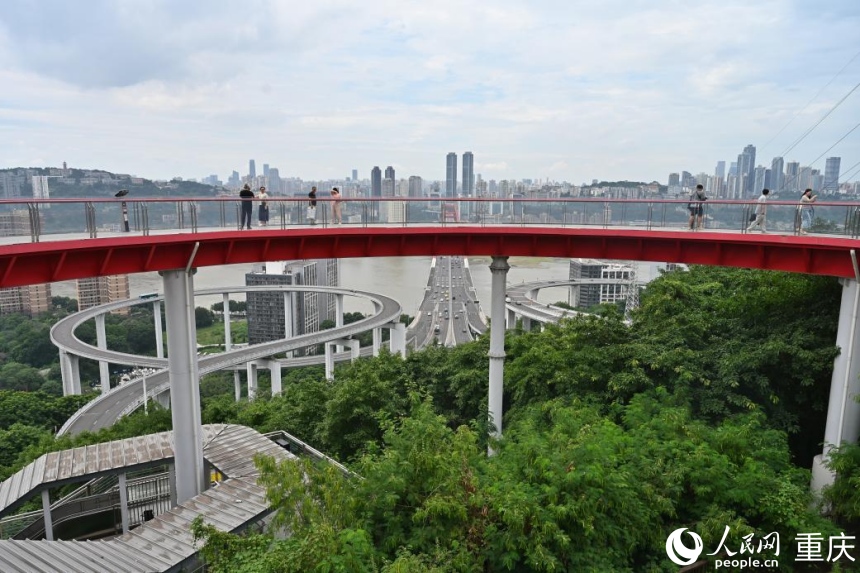 比如,2022年建成的百米高差蘇家壩步道,不僅縮短了銅元局雙峯山路片區近4萬居民軌道出行時間,依勢而建的“銅元之光·天空島”城市陽台更是火爆出圈。“懸浮”於半空,用270°超大視角,可將山城“8D魔幻”美景盡收眼底。