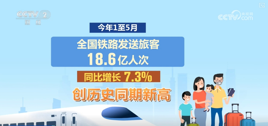 數據顯示,2025年1至5月,全國鐵路發送旅客18.6億人次,同比增長7.3%,創歷史同期新高。全國鐵路日均開行旅客列車11243列,同比增長7.5%。其中,5月1日全國鐵路開行旅客列車13752列、發送旅客2311.9萬人次,分別創單日客運能力投放、旅客發送量歷史新高。