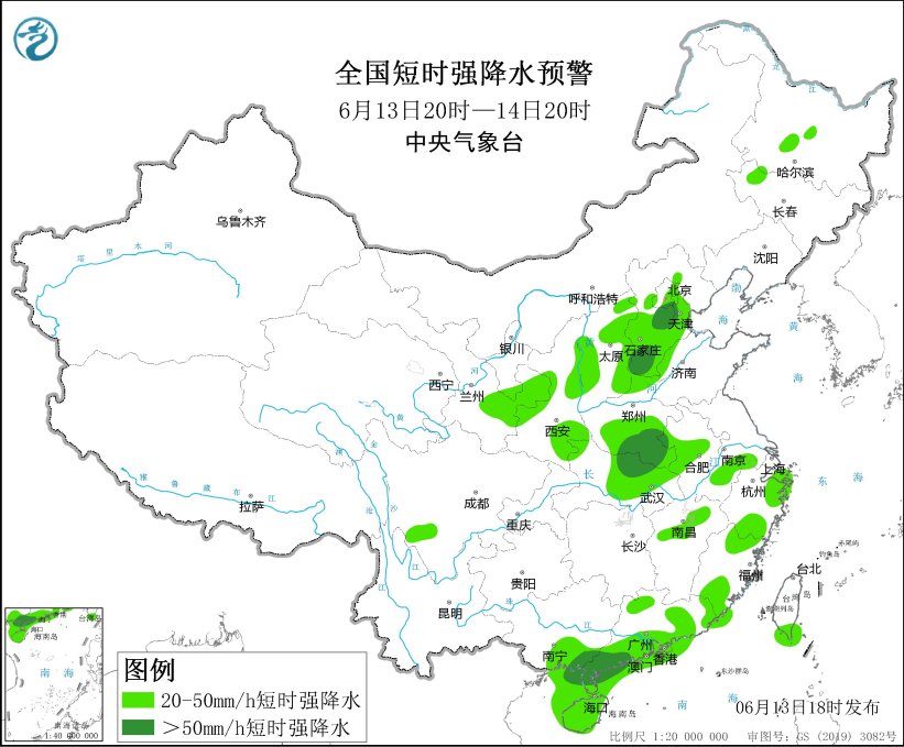 預計6月13日20時至14日20時,西北地區東部、華北、黃淮、華南南部等地的部分地區將有8級以上雷暴大風或冰雹天氣,其中,甘肅東南部、陝西中西部、河北南部、河南南部和西部、湖北北部、廣東西南部等地的部分地區將有10級以上雷暴大風,最大風力可達11級以上;東北地區中北部、西北地區東部、華北、黃淮、江南東部、華南南部等地的部分地區將有小時雨量大於20毫米的短時強降水天氣,其中,河北中南部、北京東南部、天津中西部、河南南部、安徽北部、湖北北部、廣西東南部、廣東西南部等地的部分地區小時雨量大於50毫米,最大可達70毫米以上。