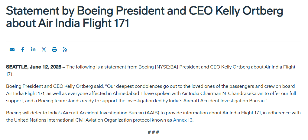 6月12日,波音公司官網發佈波音總裁兼首席執行官凱利·奧特伯格關於印度航空171航班的聲明。