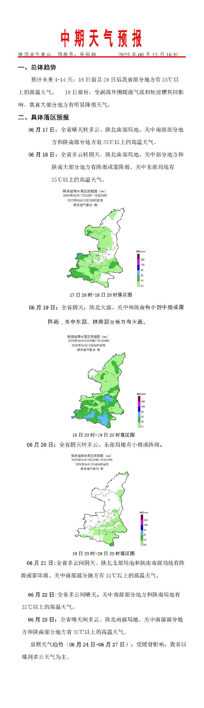 預計未來4-14天:18日前及20日後我省部分地方有35℃以上的高温天氣。 19日前後,受副高外圍暖濕氣流和短波槽共同影響,我省大部分地方有明顯降雨天氣。