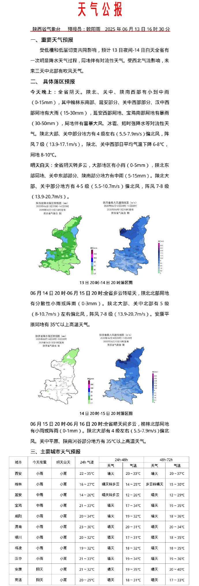 受高空槽和低層切變共同影響,預計6月13日15時至14日15時,陝北、關中北部及西部、漢中西部有雷暴天氣,其中榆林南部、延安大部、銅川西部、咸陽北部、寶雞大部、漢中西部局地有雷暴大風,陣風可達8級(17.2m/s)以上,榆林東部局地(佳縣)、延安北部及東部局地(延長、志丹、富縣)、咸陽北部局地(旬邑)、寶雞北部局地(隴縣)有冰雹,榆林東部局地(佳縣)、延安東部及西部局地(延川、延長)、咸陽北部局地(彬縣)、寶雞北部(千陽、麟遊)有短時強降水(小時雨強10-20mm/h,個別點可達30mm/h以上)。