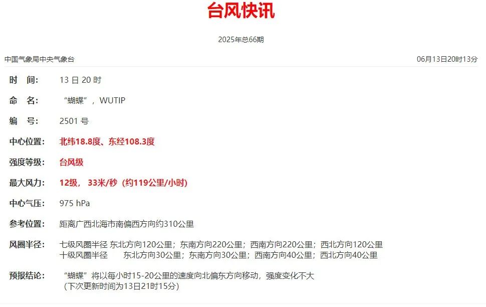 據@廣州天氣,13日20時,颱風“蝴蝶”中心位於廣州西南方向約720公里的海南島西部近海海面上,中心附近最大風力12級(33米/秒),達到了颱風級標準!