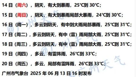 6月15日夜間—16日,粵北和珠江三角洲市縣有大雨到暴雨,局部大暴雨,其餘市縣多雲,有中(雷)雨。