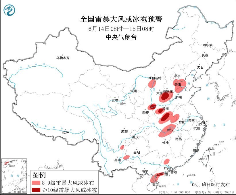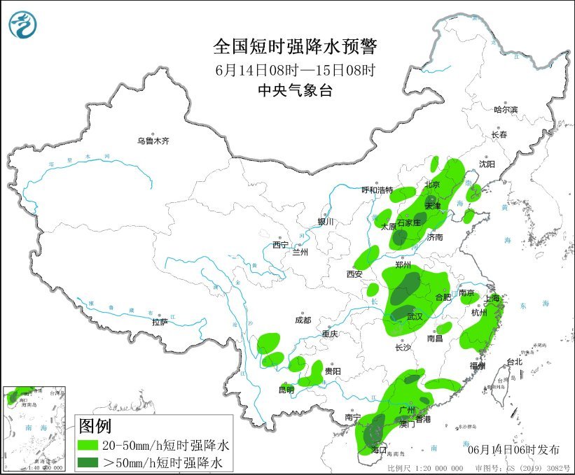 預計6月14日8時至15日8時,西北地區東部、華北、黃淮、江漢、華南南部等地的部分地區將有8級以上雷暴大風或冰雹天氣,其中,山西中南部、河北南部、河南南部和西部、湖北北部、廣東西南部等地的部分地區將有10級以上雷暴大風,最大風力可達11級以上;西北地區東部、華北、東北地區南部、黃淮、江漢、江南地區東部、西南地區南部、華南等地的部分地區將有小時雨量大於20毫米的短時強降水天氣,其中,山西南部、河北中南部、天津、河南東南部、湖北中東部、廣東中西部等地的部分地區小時雨量大於50毫米,最大可達70毫米以上。