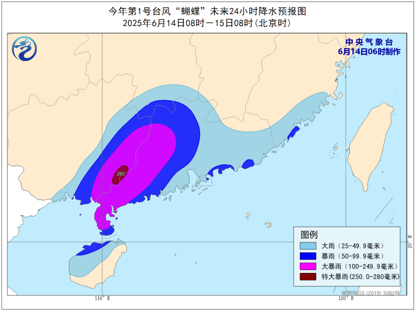 6月14日08時至15日08時,廣東大部、廣西東部、海南島中北部、福建東南部、湖南南部等地有大到暴雨,其中,廣東西部、廣西東部等地部分地區有大暴雨,局地特大暴雨(250~280毫米)。上述部分地區伴有短時強降水(最大小時降雨量20~50毫米,局地可超過70毫米),局地有雷暴大風等強對流天氣。