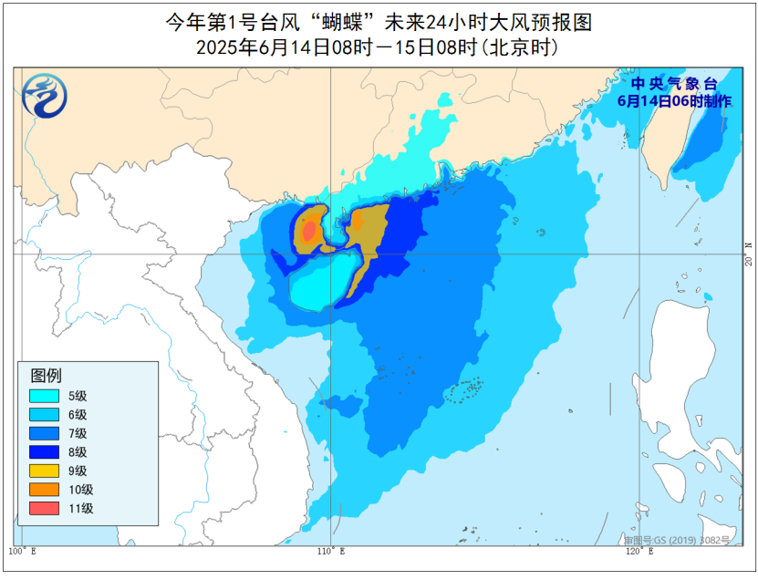 6月14日08時至15日08時,南海西部、北部灣、瓊州海峽、西沙羣島、中沙羣島、海南島沿海、廣東中西沿海、廣西沿海、雷州半島將有6~8級風,陣風9~10級,颱風中心經過的海域或地區風力可達9~11級,陣風12~13級。