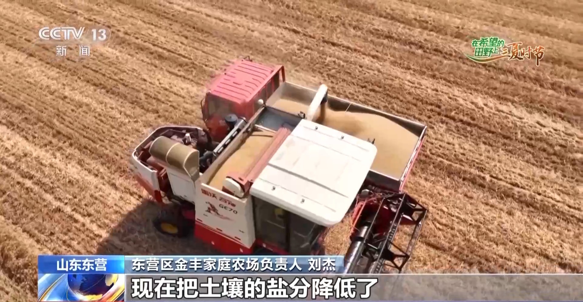 *東營區金豐家庭農場負責人 劉傑:*以前這裏的鹽鹼度程度很高,白茫茫的一片,主要種植就是耐鹽鹼作物棉花。通過高標準農田建設,以大水漫灌壓鹼、深挖排鹼溝排鹼、下滲管排鹼一系列措施把土壤的鹽分降低了。現在,小麥都能種植了。今年主要種植了4300多畝小麥,小麥顆粒飽滿都非常好,預計今年小麥產量每畝超1000斤。