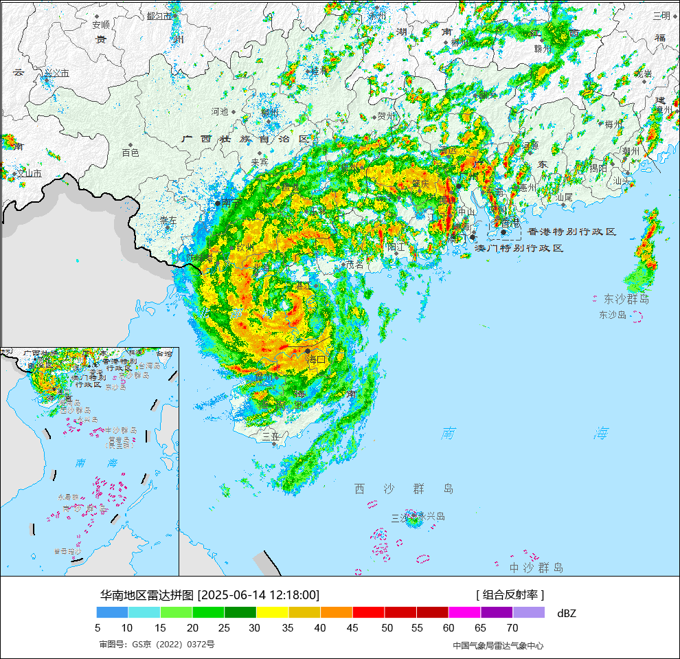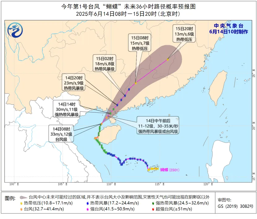 大風預報:6月14日14時至15日14時,南海西部、北部灣、瓊州海峽、西沙羣島、中沙羣島、海南島沿海、廣東中西沿海、廣西沿海、雷州半島將有6至8級風,陣風9至10級,部分地區風力有9至10級,颱風中心經過的海域或地區風力可達11至12級,陣風13至14級。
